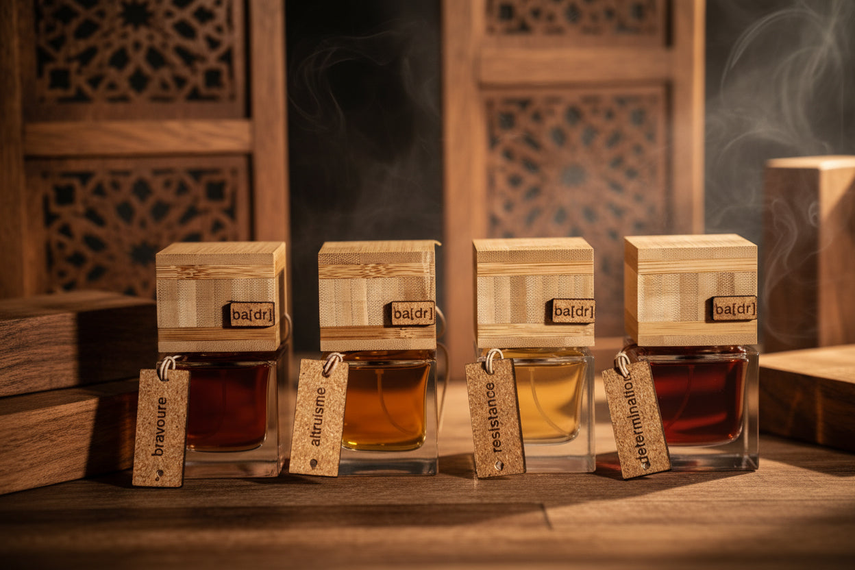 Les matières que nous utilisons sont sélectionnées pour leur qualité, pas pour leur coût. L'oud que vous sentez vient de filières tracées. La rose, le musc, l'encens — chaque ingrédient est choisi parce qu'il a quelque chose à dire.